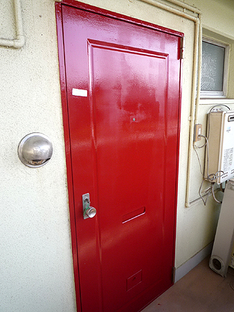 | 玄関扉は鮮やかなレッド。玄関タイルは個性的でレトロなタイルを使用しました |