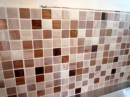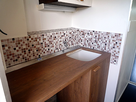 | タイルは貼る際にモダンなデザインが施され、キッチン周りがおしゃれに変身しました。 |