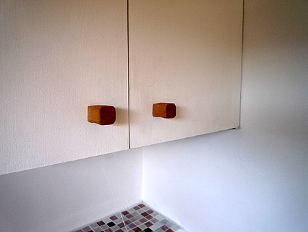| キッチン収納の取っ手も学生さんの手作りです。 |