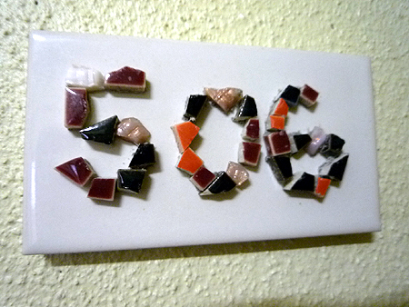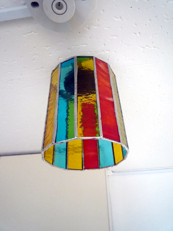 | お部屋からみたキッチンスペース。シンクも学生さんが水だけで汚れを落とす激落ちくんを使い、ピカピカに。キッチン横の洗濯機置き場も、タイルでかわいく彩りました。ランプシェードは手作りのステンドグラスです。 |