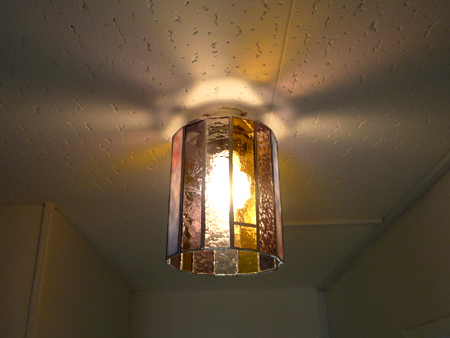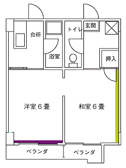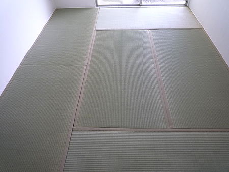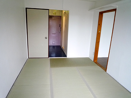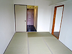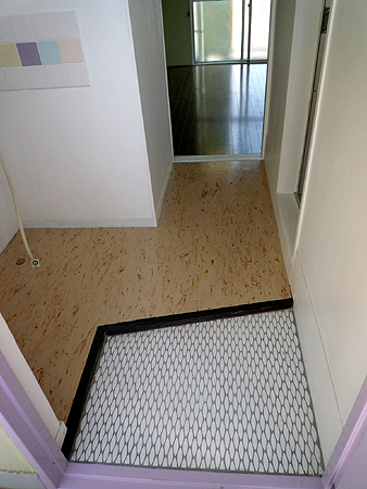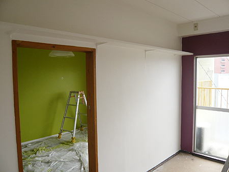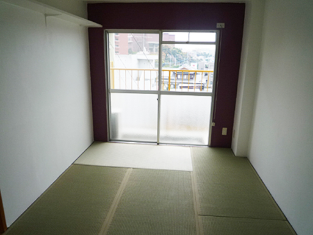 | 和室の壁一面はバイオレット、畳の縁はベーシュです。 また、両方のお部屋の壁には飾り棚がついています。白い塗装も学生さんが行いました。 |