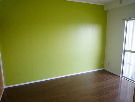 | 洋室の壁一面をライトグリーンに。フローリングはダークブラウン、グリーンが白い壁に引き立ちます。 |